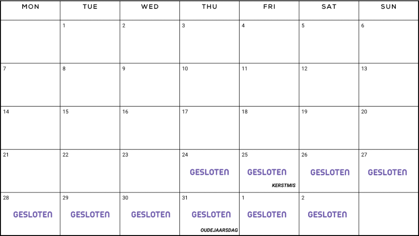 KERSTMIS 2025, woensdag 24 december tot en met zondag 04 januari 2025 : GESLOTEN
