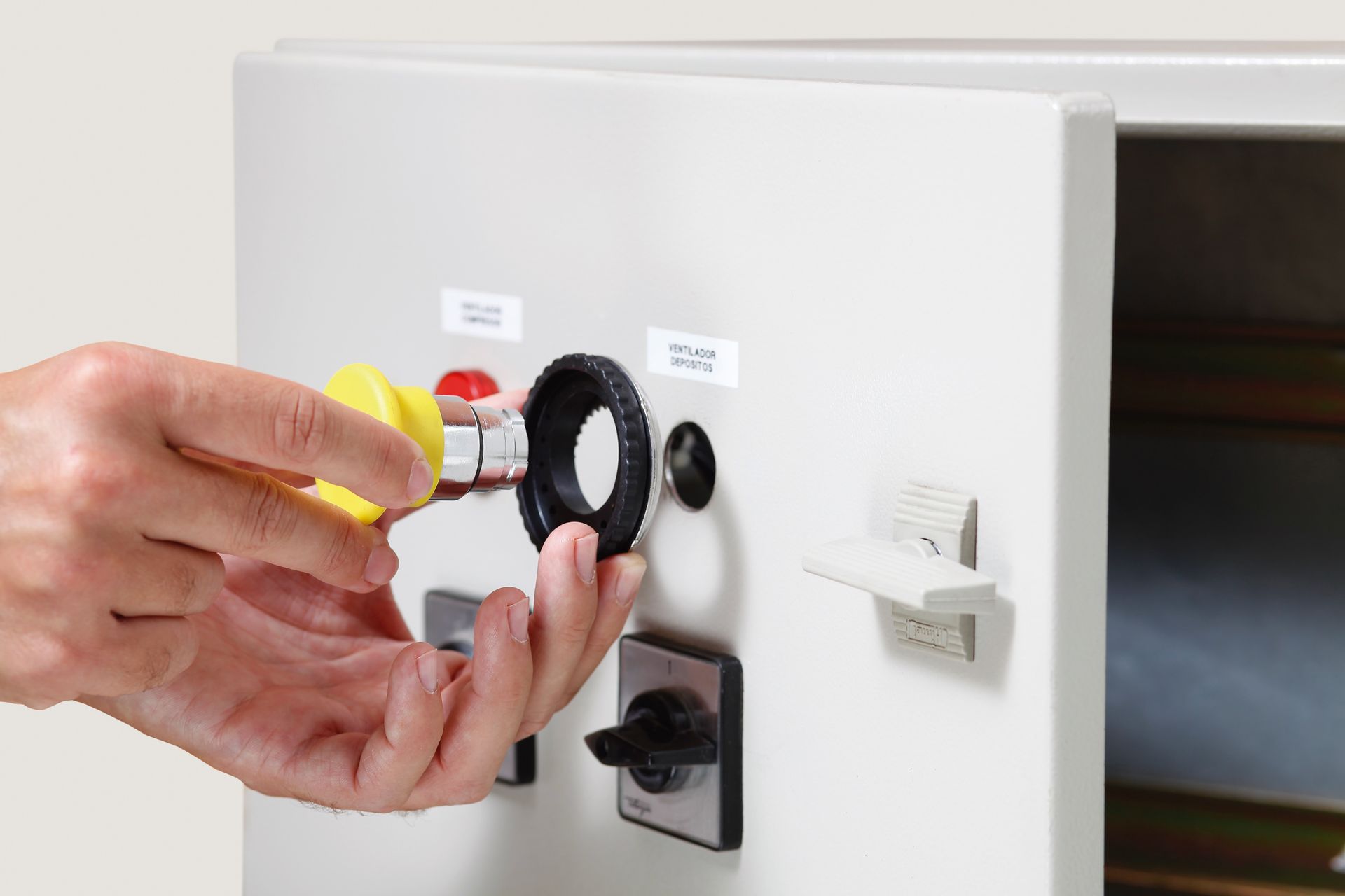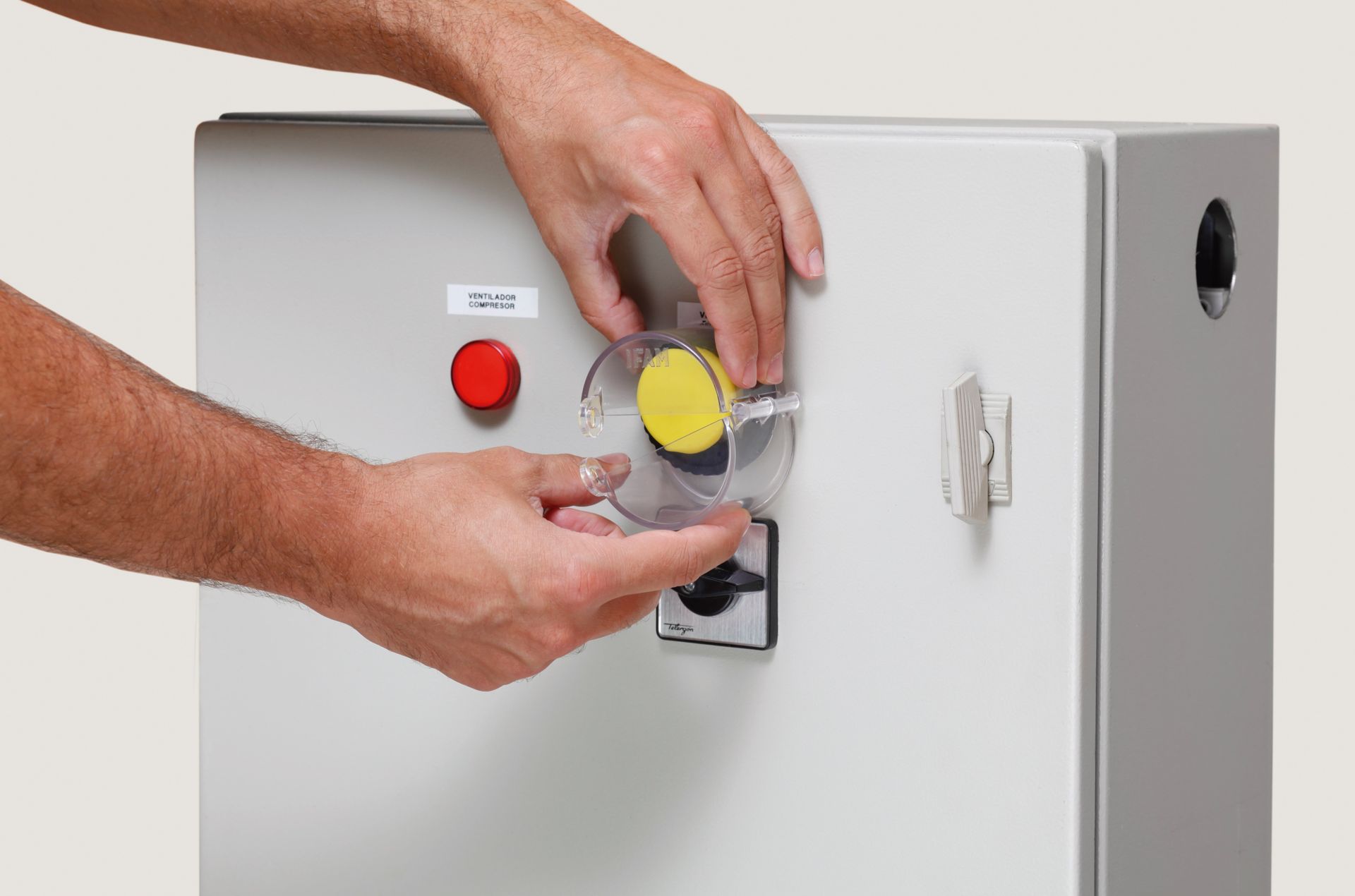 Stap 6: Controleer of de noodstopknop stevig vergrendeld is en niet kan worden ingedrukt. Test de vergrendeling om er zeker van te zijn dat de knop veilig geblokkeerd is.
