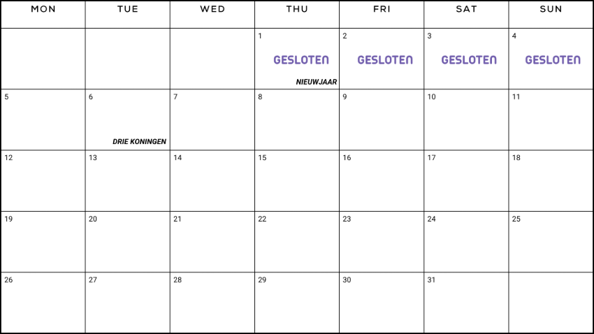 KERSTMIS 2025, woensdag 24 december tot en met zondag 04 januari 2025 : GESLOTEN