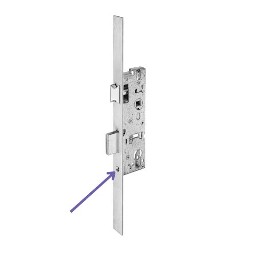 Deze schroef bevindt zich aan de zijkant van de deur, net onder de nachtschoot van het slot. De nachtschoot is de blok die uit het slot komt als deze vast gedraaid word.